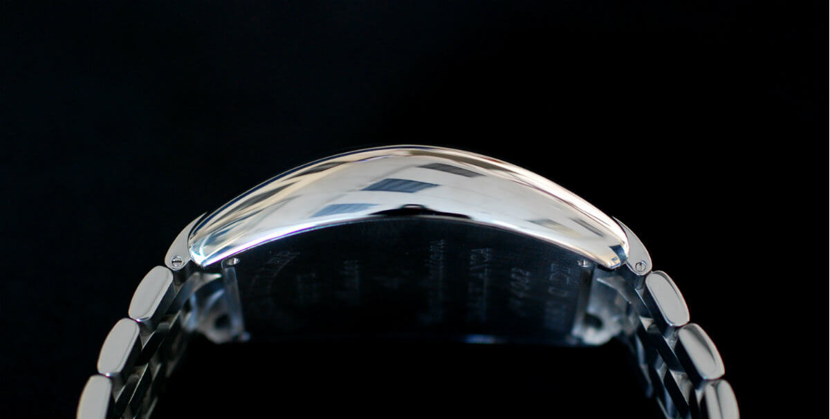 We have just finished servicing this Franck Muller Casablanca watch and the customer wanted the case returned to as new condition. The only problem with this is photographing it afterwards! Franck Muller cases tend to have large curved surfaces that as you can see end up coming back to a mirror like shine after lots of work with our case polisher. It just makes it very hard to photograph without showing either the camera or ceiling as can be seen in the below image.